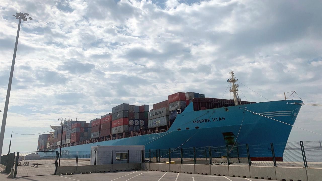 El carguero Maersk UTAH', de la compañía Maersk, amarrado en el Puerto de Valencia. (Foto: EFE)