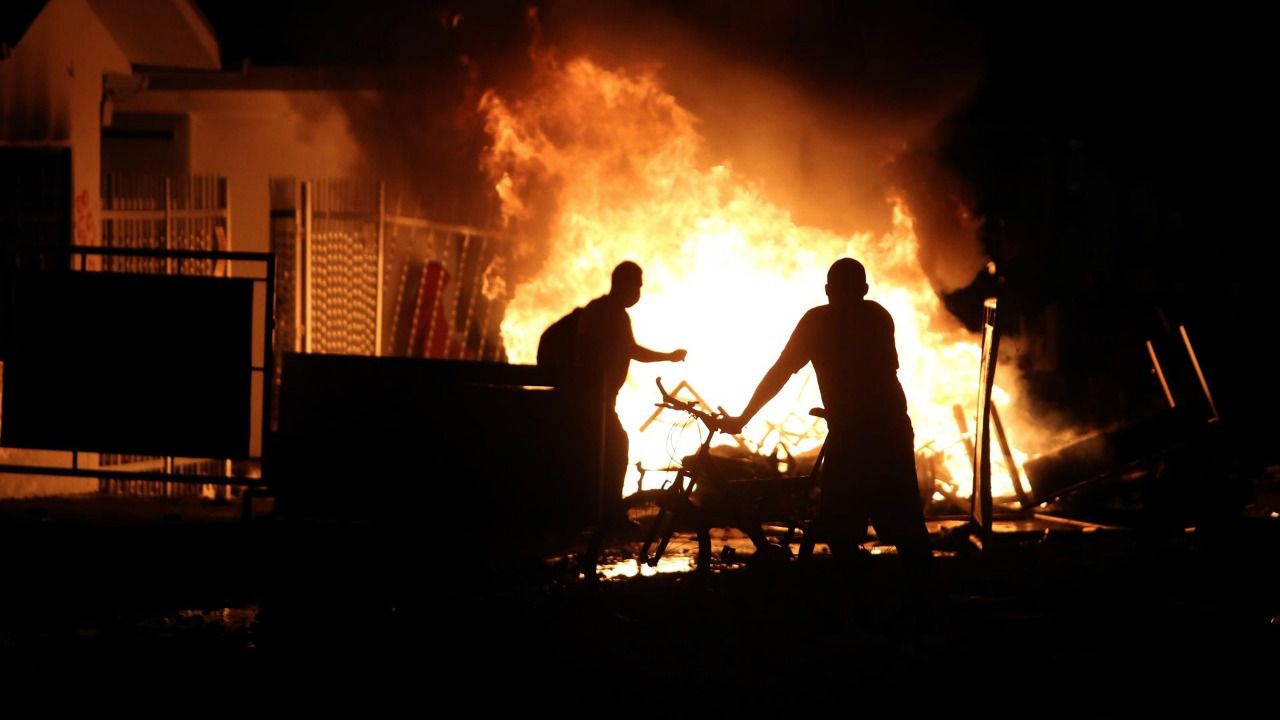 Manifestantes caminan frente a una sede en llamas de la Fiscalía este viernes.