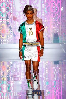 Los trajes de seda y tejidos brillantes, de vivos y mezclados colores, también tuvieron protagonismo en la presentación, en la que no faltó un guiño a la selección de fútbol de Italia que juega la Eurocopa estos días en Roma, con varias piezas con los colores de la bandea tricolor italiana que recordaban la equipación futbolística.