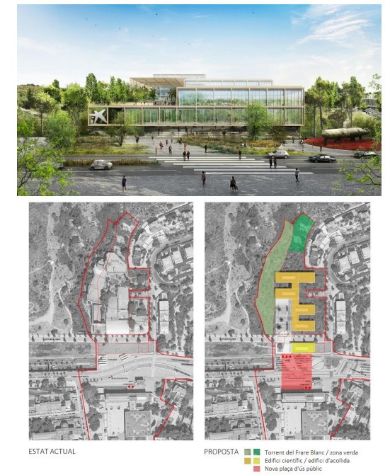 Una de las novedades destacadas es una nueva plaza pública que la Fundación ”la Caixa” urbanizará sobre la ronda para que el nuevo centro de investigación se conecte con CosmoCaixa. Esta plaza generará un nuevo espacio urbano que creará sinergias entre los dos equipamientos y favorecerá los usos públicos abiertos a la ciudadanía del entorno. Además, en la parte posterior del centro de investigación, se habilitará una zona verde pública de 1.200 m2, contigua al Parque Natural de la Sierra de Collserola.