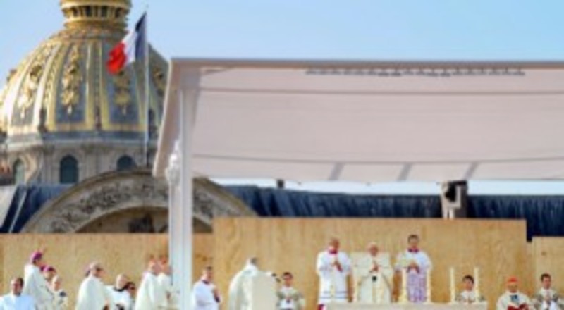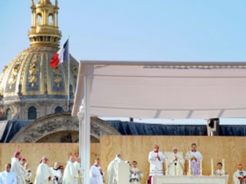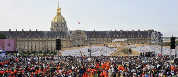 Rodeado de la belleza de la explanada de los Inválidos, Benedicto XVI ofició una multitudinaria misa mirando al parisino río Sena y al majestuoso puente Alexandre III. Más de 260.000 fieles han acudido a la cita con el Papa ataviados con los colores y banderines del Vaticano. Muchas familias y muchos jóvenes, de todas las edades y de diferentes lugares de Francia, han sido los protagonistas de esta ceremonia. Algunos de los asistentes habían pasado parte de la noche en la explanada tras recorrer el "camino de la luz" desde la catedral de Notre Dame.