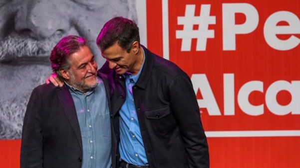 El presidente del Gobierno y secretario general de los socialistas, Pedro Sánchez (d), presenta la precandidatura del exseleccionador de baloncesto Pepu Hernández (i) a las primarias del PSOE para ser el candidato a la alcaldía de Madrid.