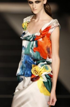 La mujer de Victorio & Lucchino apuesta claramente por el vestido como prenda fetiche de esta temporada. Pero no es un vestido cualquiera, sino una composición salpicada de volantes donde esta decoración se convierte en la gran protagonista para adquirir formas novedosas que envuelven el cuerpo de la mujer. La seda, la tafeta, el punto de crepé, el lino o el georgette emprenden juegos acariciadores sobre la silueta femenina sin fijarse demasiado en ella, para conseguir un efecto racial salpicado de frescura y elegancia.
