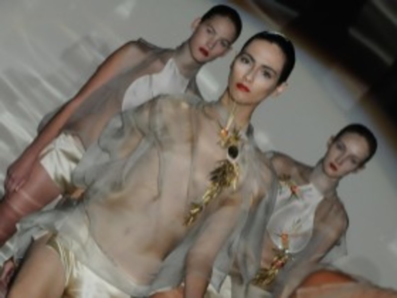 Lydia Delgado permanece fiel a su gusto por las prendas lenceras al igual que en su anterior colección primavera-verano, aunque esta vez lo ha plasmado a través de "shorts" combinados con blusas transparentes y grandes broches que han aportado un aire sofisticado a lo largo de todo el desfile.