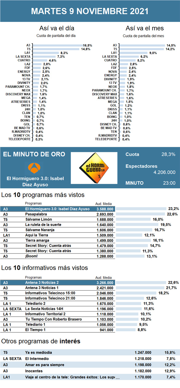 Este martes, la presidenta de la Comunidad de Madrid, Isabel Díaz Ayuso, visitó por primera vez el programa El Hormiguero 3.0 y, no sólo triunfó en lo que a audiencia se refiere y se impuso como lo más visto del día, sino que supuso los mejores datos de esta temporada para el espacio de Antena 3 y su quinta mejor cuota histórica.