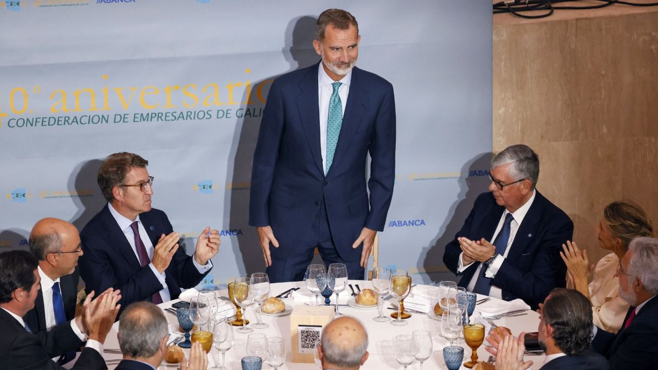 | El rey Felipe VI (c) y el presidente de la CEOE, Antonio Garamendi, (i) junto al presidente de la Xunta, Alberto Núñez Feijóo (3i); la vicepresidenta del Gobierno Yolanda Díaz (d) y el presidente de los empresarios gallegos, Juan Manuel Vieites (2d). (Foto: Efe) |