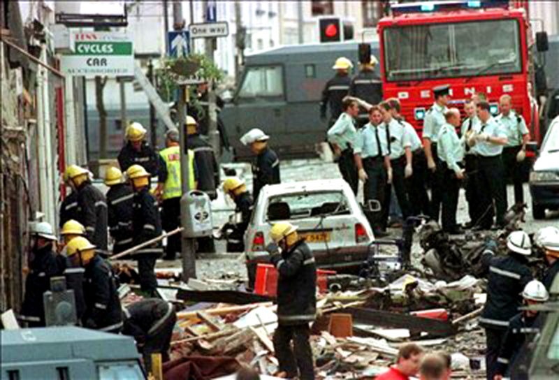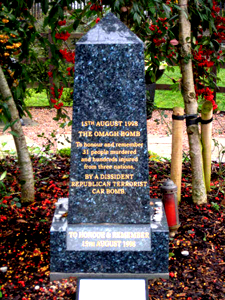En concreto, el monolito incluye la frase "En este lugar, 31 personas murieron y cientos fueron heridas, procedentes de tres naciones, por un coche bomba de un grupo terrorista disidente republicano, el 15 de agosto de 1998". Estas palabras fueron colocadas por las propias víctimas en 2005, después de que el pequeño monumento fuese colocado en 2002 por el Consistorio de Omagh.