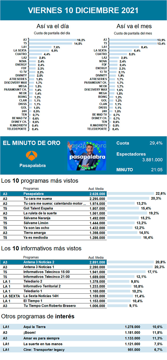Tu cara me suena se mantiene sin demasiadas dificultadas como líder de las noches de los viernes, reuniendo a 2,2 millones de espectadores. Su rival, Got Talent, se quedó en 1,8 millones en la cadena rival, Telecinco. Al que poco le importan horarios y luchas es Pasapalabra, que fue tanto el programa más visto del día con 2,6 millones de televidentes de media como congregador del minuto de oro, con 3,8 millones de personas pendientes del rosco.