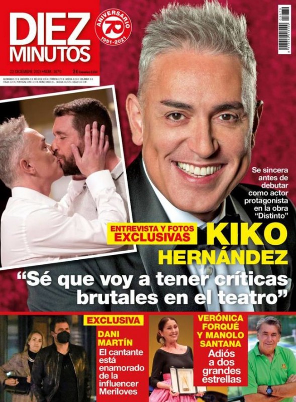 Diez Minutos entrevista a Kiko Hernández antes de debutar como actor en la obra de teatro Distinto. La revista recoge fotografías de Dani Martín junto a la influencer Meriloves. Como el resto de revistas del corazón, Verónica Forqué es otra de las protagonistas, así como Manolo Santana.