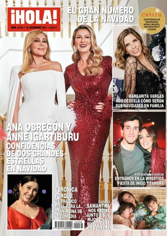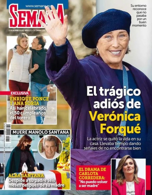 Semana también recuerda a Verónica Forqué y a Santana, y publica instantáneas de la capilla ardiente del tenista. Además, informa del "drama" de Carlota Corredera, que explica que no puede volver a ser madre. Hola dedica esta semana su número a un especial de Navidad protagonizado por Anne Igartiburu y Ana Obregón, quienes repetirán desde la Puerta del Sol este año para despedir el año. La revista publica en exclusiva imágnees de la una fiesta de Tamara Falcó y su novio.Conmoción por el suicidio de Forqué, titula Lecturas, que informa también en portada de la despedida de Alba Santana a su padre y de que Lydia Lozano celebra su cumpleaños con su madre.