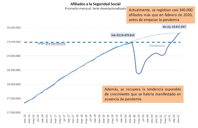 Los datos de diciembre muestran, además, que no sólo se ha alcanzado el nivel de empleo previo a la pandemia, marcando máximos históricos en términos desestacionalizados, sino que también se ha recuperado la tendencia esperable de crecimiento que se hubiera producido en ausencia de pandemia. Por sectores, respecto al inicio de la pandemia, los que más han incrementado el número de afiliados son los que incorporan nuevas tecnologías y también los relacionados con la sanidad.