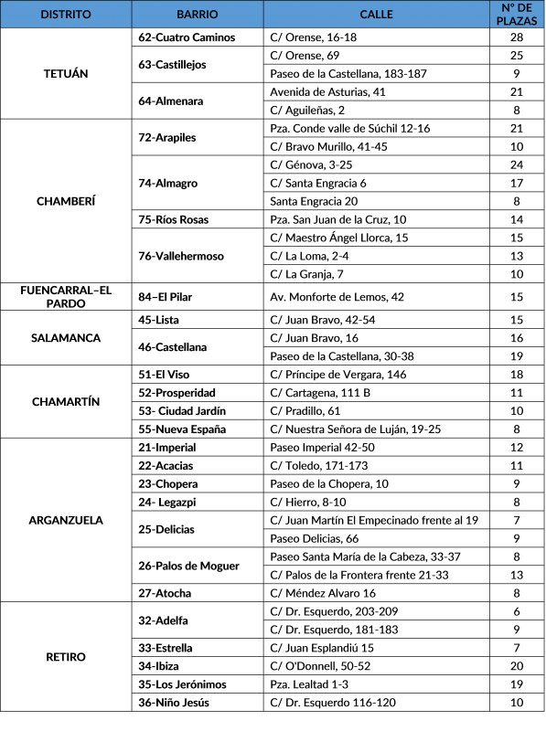 De las 1.130 plazas de alta rotación previstas para toda la ciudad, durante las próximas dos semanas se habilitarán 491 reservas blanquiazules en 26 barrios de siete distritos. El resto se señalizará a lo largo del primer semestre del año. Así, la medida llega ahora a los distritos de Chamberí (132 plazas); Tetuán (91); Arganzuela (85); Retiro (71); Salamanca (50), Chamartín (47), y Fuencarral-El Pardo (15).