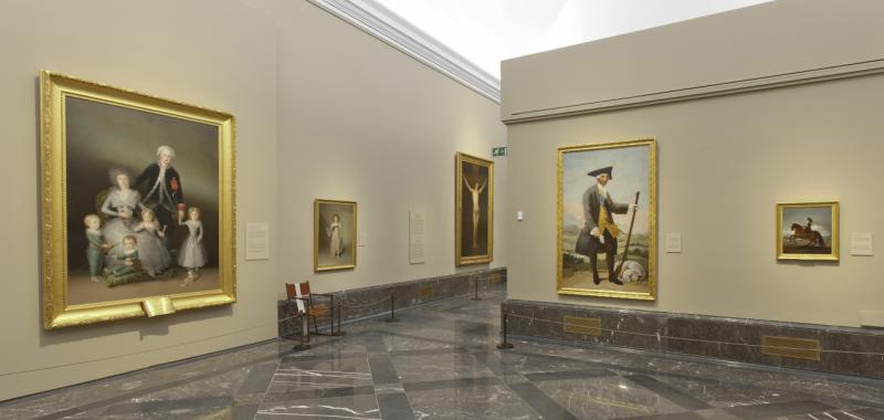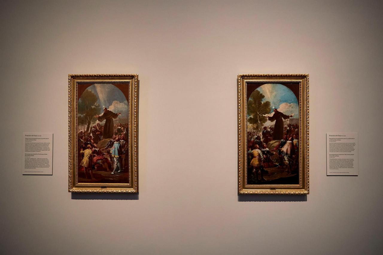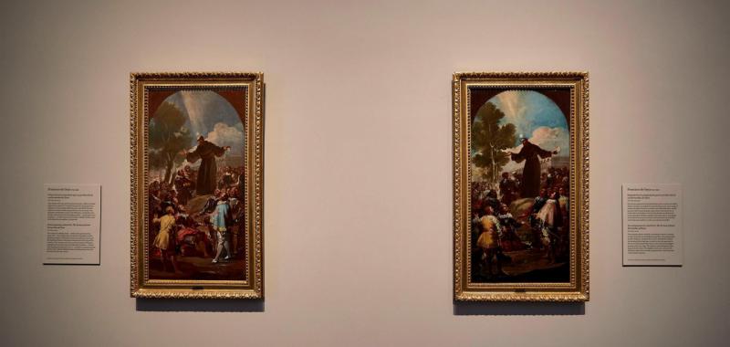 El rocorrido propuesto por el Prado invita a acceder en primer lugar a la sala 34, donde durante un año va a mostrar en una exposición de pequeño formato dos bocetos de Goya de la colección Fundación Tatiana Pérez de Guzmán el Bueno preparatorios del cuadro de altar de San Bernardino de Siena en la basílica de San Francisco el Grande en Madrid, una obra de gran complejidad sobre la que los trabajos preparatorios ahora expuestos y rara vez vistos en público aportan una información muy valiosa para entender el proceso creativo del artista. Acompañan a estos bocetos piezas de pintura religiosa de Goya como el Cristo crucificado, la Sagrada Familia o la Inmaculada Concepción.