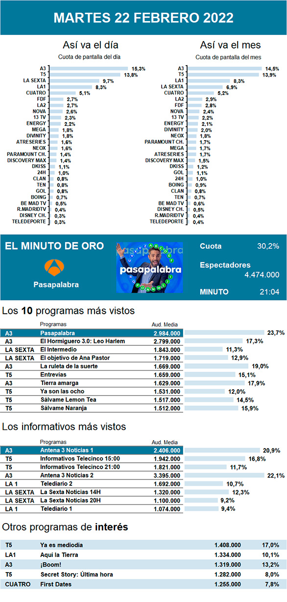 AUDIENCIAS: MARTES 22 DE FEBRERO DE 2022