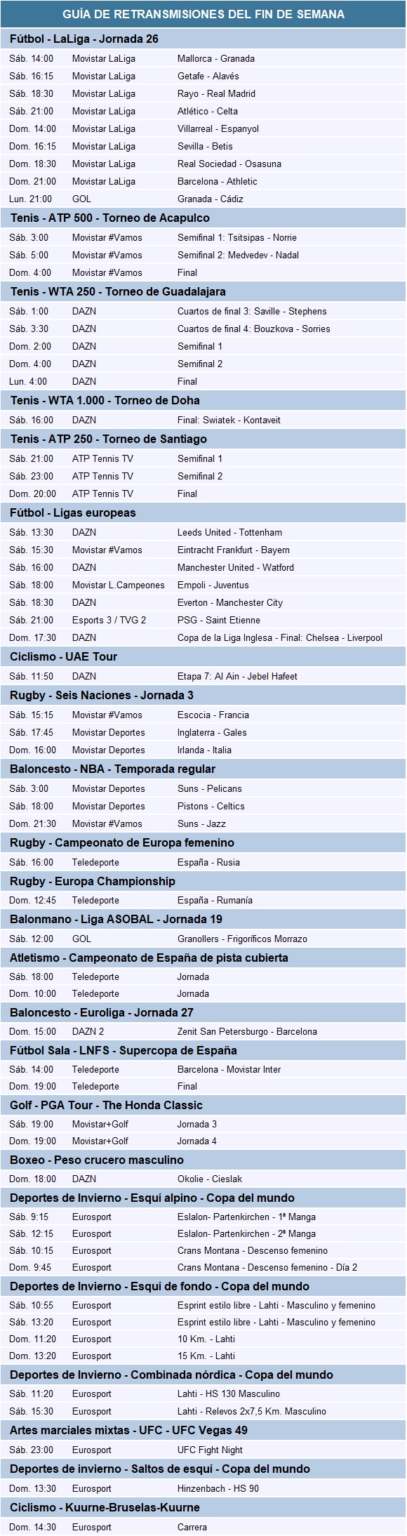 Además, avanza el Seis Naciones y Rafa Nadal busca otro título.