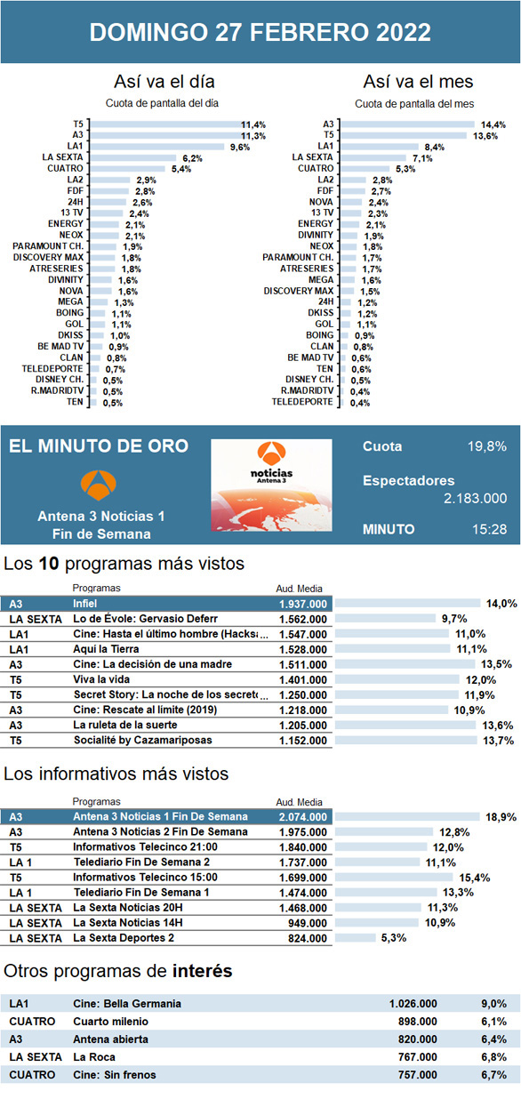 AUDIENCIAS: DOMINGO 27 DE FEBRERO DE 2022