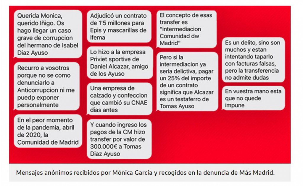 Es reseñable igualmente que estos SMS los recibió la líder de Más Madrid el pasado 7 de noviembre y la denuncia a la Fiscalía Anticorrupción no se interpuso hasta el 18 de febrero, más de tres meses después.
