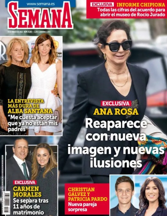 Christian Gálvez y Patricia Pardo son los protagonistas de la portada de Semana, que publica imágenes de la nueva imagen de Ana Rosa Quintana como consecuencia del tratamiento al que se está sometiendo para combatir el cáncer que le fue diagnosticado hace meses.