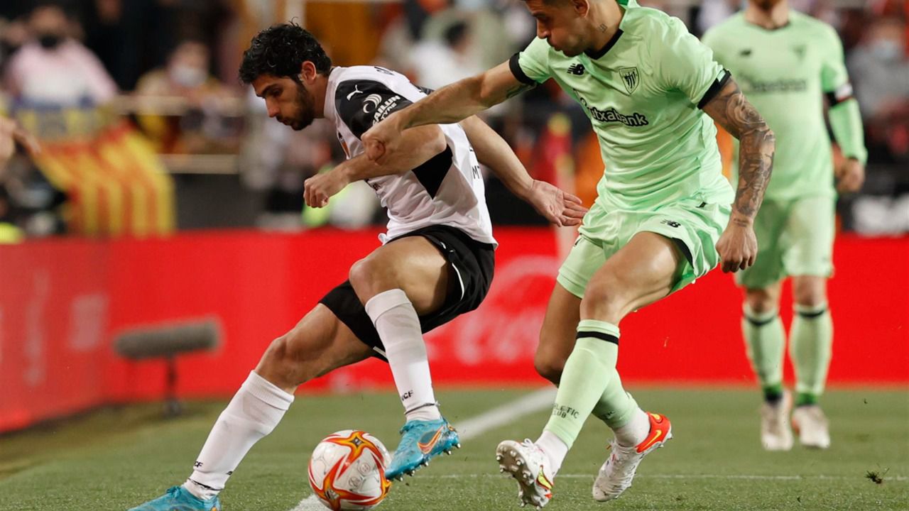 El problema para sus intereses residió, simplemente, en que sus jugadores no tuvieron su día en la relación con el cuero. Los errores en el pase les cortaron el ritmo pretendido y no alcanzaron a activar un asedio sobre el arco valenciano. Agudizaron su monopolio de la posesión, mas exhibieron impotencia en tres cuartos de cancha. También cuando comparecieron Nico Williams y Zárraga. Además, antes del desenlace ya se percibió que el fuelle les iba a fallar. No llegaron a la orilla y, más aún, Aguirrezabala negó a Carlos Soler la sentencia en el tramo decisivo. Mestalla festejó de nuevo.