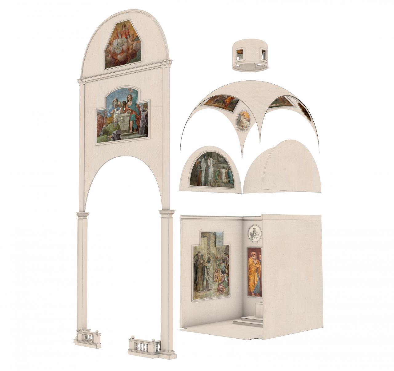 Además el museo de Barcelona cuenta con otras tres pinturas al fresco que representan al Padre Eterno, extraído del cierre semiesférico de la linterna, a san Pedro y a san Pablo, santos que flanqueaban el cuadro del altar en el muro testero de la capilla.