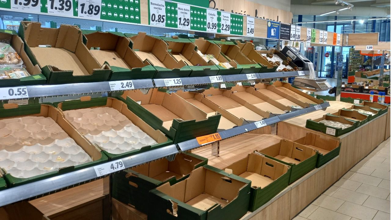 Estantes vacíos en un supermercado por la huelga del transporte.