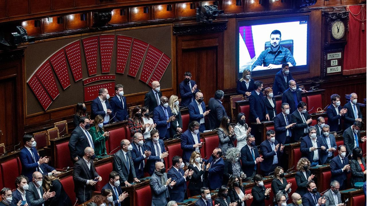 "La invasión dura desde hace 27 días, un mes, y necesitamos otras sanciones y otras presiones para que Rusia no pueda abastecerse de reservas militares en Libia o Siria, y para que vuelva la paz", dijo Zelenski, que fue recibido con los cerca de mil parlamentarios italianos puestos en pie y con un fuerte aplauso.