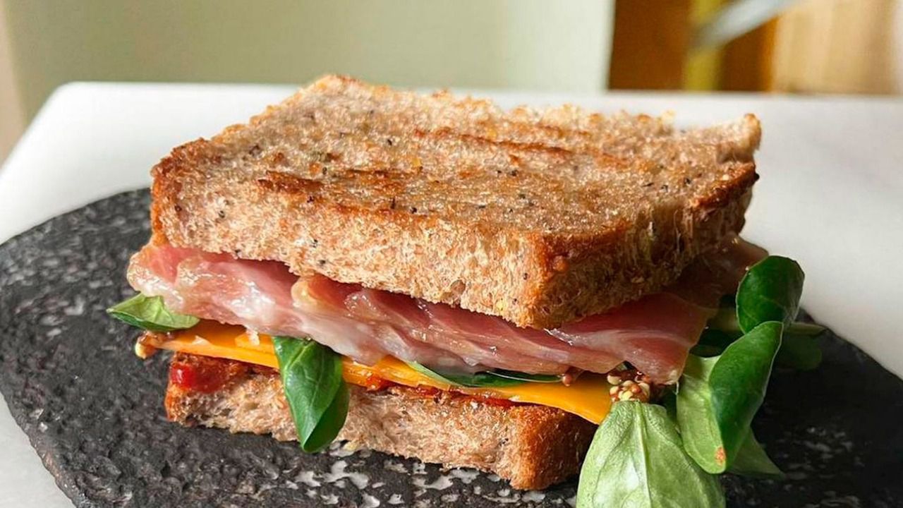 El bocadillo, hecho con pan de cerveza, está elaborado con ventresca de atún rojo, grasa de entrecots madurados, piquillos confitados, piparras encurtidas, mostaza antigua, queso cheddar ahumado y canónigos.