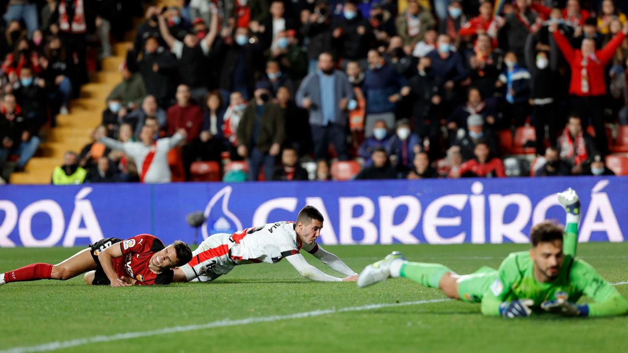Isi Palazón, el jugador más determinante del Rayo, pudo igualar la contienda con un remate por bajo que de nuevo se encontró con Mamardashvili, que volvió a salvar a su equipo.