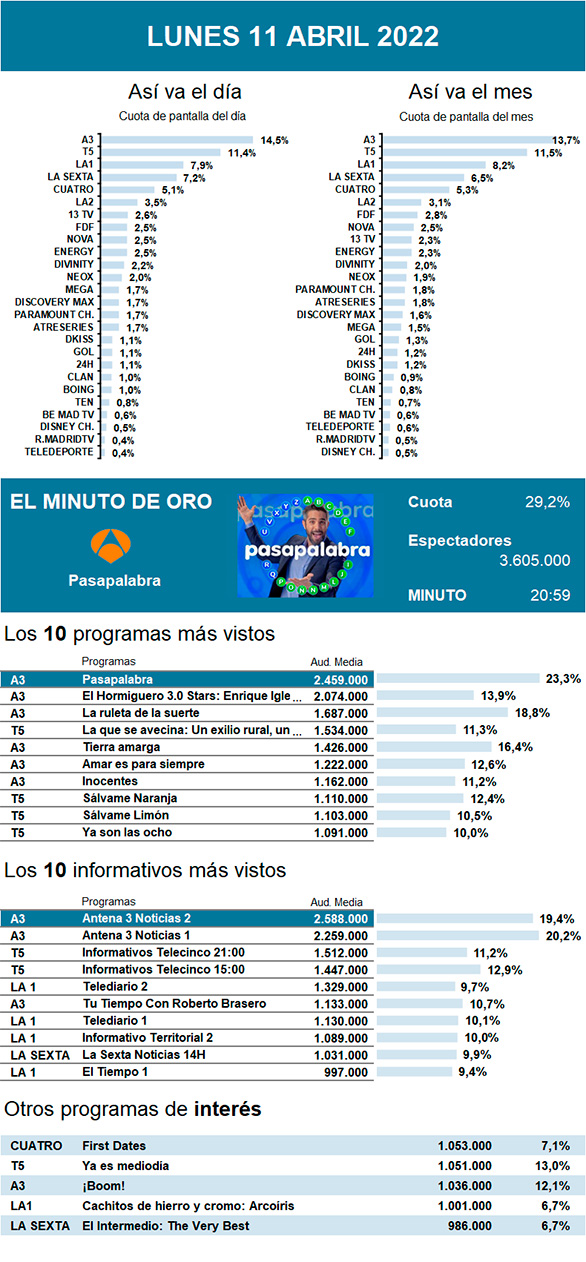 Sin embargo, durante la primera de esas franjas, El Hormiguero 3.0 volvió a eclipsar a la serie incluso aunque este lunes perdió casi medio millón de espectadores debido a la reposición de un programa por su descanso de Semana Santa.
