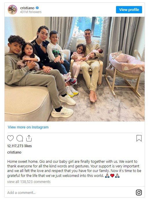 En una publicación de Instagram, Ronaldo posa con la recién nacida y con el resto de su familia, incluida su pareja.