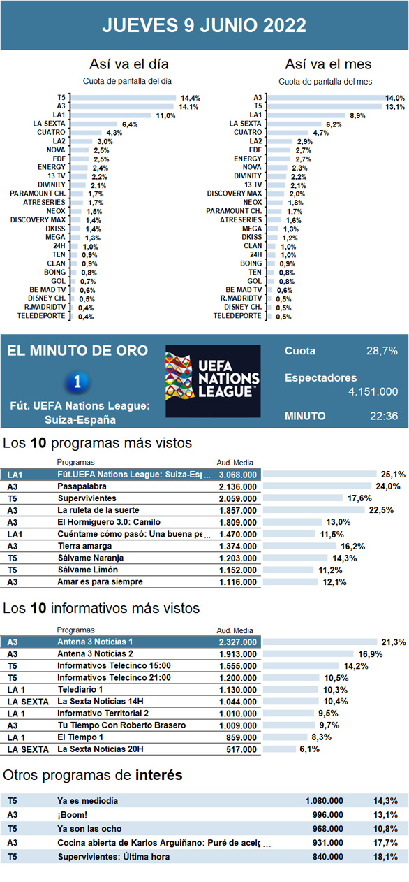 AUDIENCIAS: JUEVES 9 DE JUNIO DE 2022