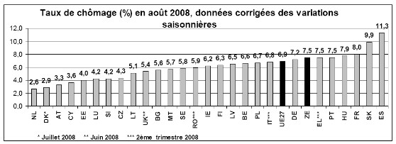 Leyenda datos del paro de agosto publicados por Eurostat: NL (Países Bajos); DK (Dinamarca); AT (Austria); CY (Chipre); EE (Estonia);LU (Luxemburgo); SI (Selovenia); CZ (República Checa); LT (Lituania); UK (Reino Unido de los 27); BG (Bulgaria); MT (Malta); SE (Suecia); RO (); IE (Irlanda); FI (Finlandia); LV (Letonia); BE (Bélgica);EL (Grecia); PL (Polonia); IT (Italia); UE (Unión Europea); DE (Alemania); ZE (Zona Euro); HU (Hungría); PT (Portugal); FR (Francia); SK (Eslovaquia); ES (España.)La tasa de paro en la zona euro se situó en el 7,5% en agosto, una décima por encima del dato de julio y del mismo mes de 2007, mientras que en el conjunto de la Unión Europea el desempleo alcanzó el 6,9%, en línea con el mes de julio y dos décimas menos que en 2007, con España como el miembro con mayor tasa de paro al alcanzar el 11,3%, informó Eurostat.