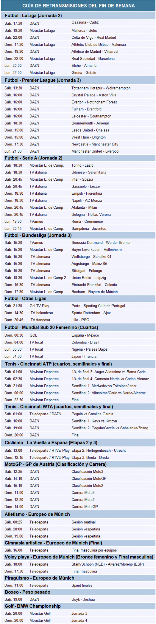 Además, La Vuelta a España, el GP de Austria de MotoGP y posibles medallas en el Europeo de Múnich.