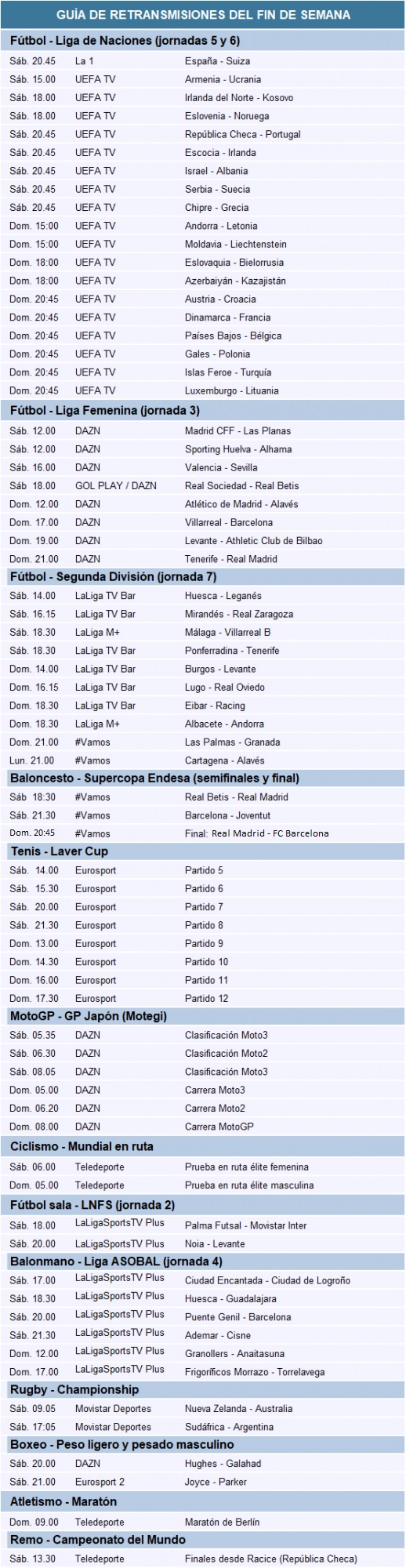 Además, la Supercopa Endesa, la Copa Laver, el GP de Japón de MotoGP o el Mundial de ciclismo en ruta.