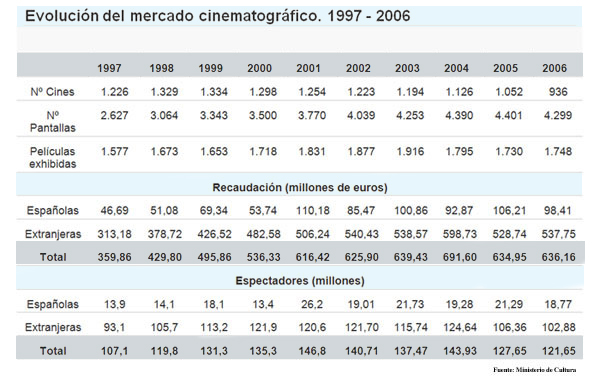 La industria sigue en retroceso, y la pérdida de espectadores supone un recorte de 28 millones en la recaudación general. En 2007 se estrenaron 347 largometrajes españoles, 35 menos que en el 2006, frente a 1.324 extranjeros. Sin embargo, las producciones estadounidenses también se han visto afectadas por la "crisis" y recabaron 72 millones de euros menos. En porcentajes, los proyectos españoles representan tan sólo el 12,6% de la cuota de mercado. Datos desoladores para los amantes de nuestro cine.