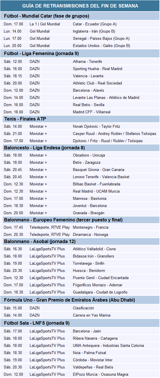 Además, la final de la Copa de Maestros de tenis, la del Europeo de balonmano femenino o el último GP de Fórmula Uno.