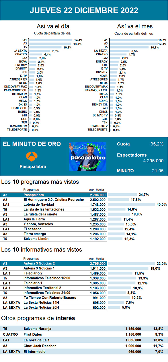 La cadena pública fue, un año más, la favorita de la audiencia para seguir el Sorteo de Lotería de Navidad. Además, en esta ocasión, logró mejorar la cuota de pantalla que alcanzó el año anterior.