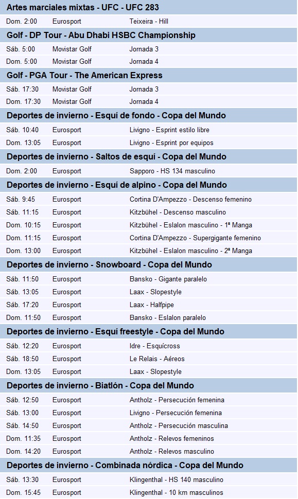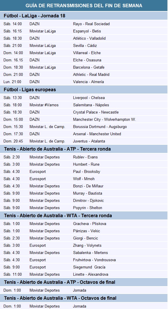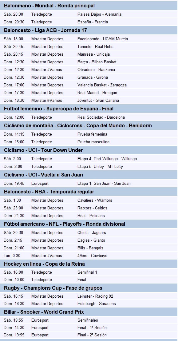 Además, sigue el Abierto de Australia de tenis, el Mundial de balonmano y los deportes de invierno.
