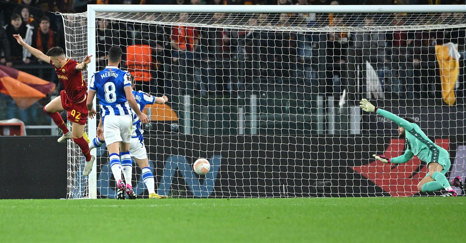 Salió Imanol Alguacil con voluntad dominadora. Juntó a David Silva, Merino, Illarramendi y Zubimendi en el eje. Se guardó el desequilibrio de Brais Méndez y de Mikel Oyarzabal para más adelante, así que le tocó Kubo la labor de conectar con el delantero Alexander Sorloth. No lo conseguiría un nipón muy bien marcado. Los locales concedieron metros y disfrutaron en su labor de achique, muy concentrados. Y golpearon muy pronto. En el minuto 13 Paulo Dybala se demostró como el futbolista más importante sobre el césped. Recuperó el cuero tras una pérdida de Diego Rico y lanzó una transición volcánica, aglutinó oponentes y abrió en el momento justo para Abraham, que centró para que El-Shaarawy marcara a placer.