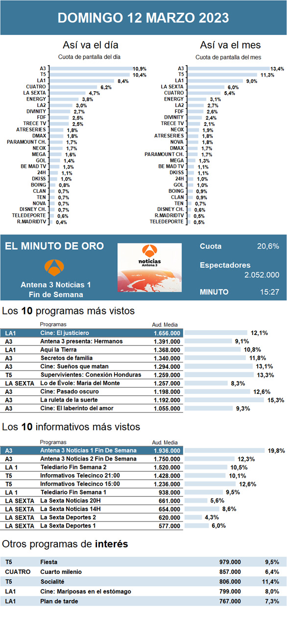 AUDIENCIAS: DOMINGO 12 DE MARZO DE 2023