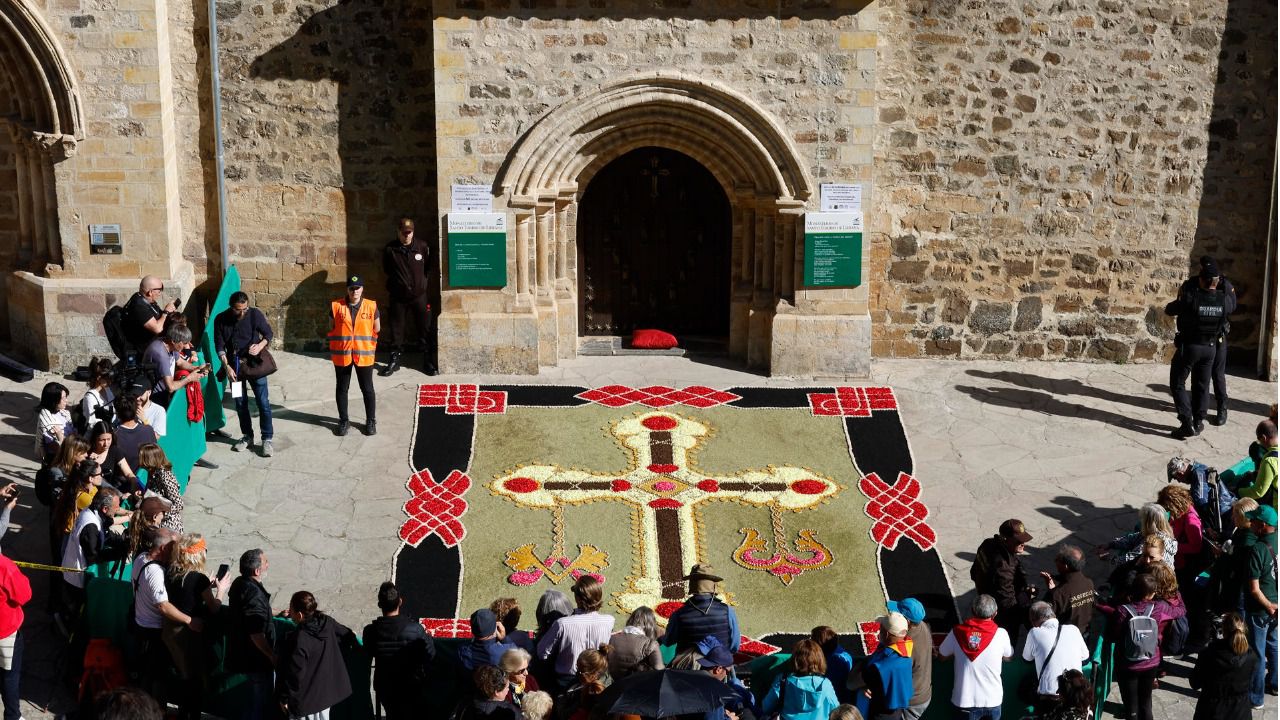 Pasadas las doce, las campanas han dado inicio a la ceremonia de apertura de la Puerta del Perdón, ante la que miembros de la Asociación de Alfombristas do Corpus Christi de Ponteareas ha extendido una alfombra de flores con la estampa del Lignum Crucis, que han empezado a elaborar al amanecer.
