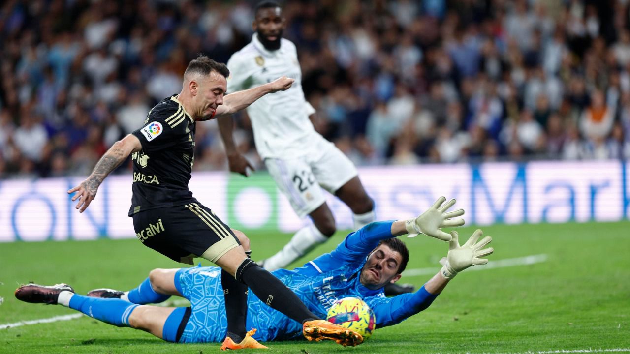 Asensio dejó su último servicio en el envite lanzando un saque de esquina en dirección a Benzema cuyo cabezazo se fue por arriba. El balear fue sustituido por Lucas Vázquez, que volvía a jugar como extremo, su posición natural. En este tramo, Aspas desaprovechó un mano a mano ante Courtois que se hizo grande al taparle el palo corto al delantero español que regateó y finalizó tarde provocando la parada del meta belga la celebración del Santiago Bernabéu.