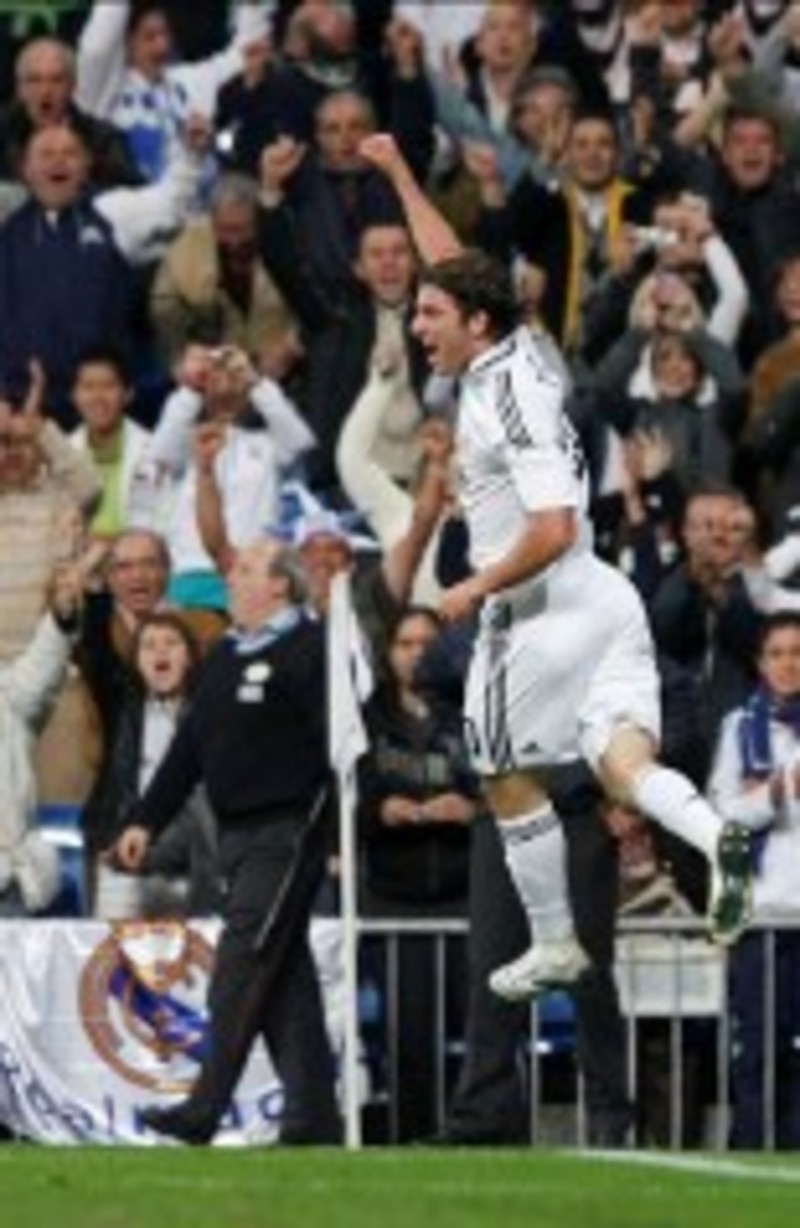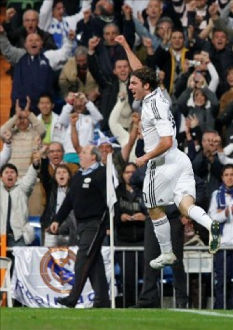 Ese remate hizo reaccionar a los blancos,quedurante diez minutos acosaron la portería visitante con continuas ocasiones de Van der Vaart, Raúl e Higuaín. Fue el argentino el que, en el minuto 28, mandó al fondo de la red un balón que culminaba un jugadón del Madrid al primer toque en el que participaron cinco jugadores, espuela de Van der Vaart incluída.