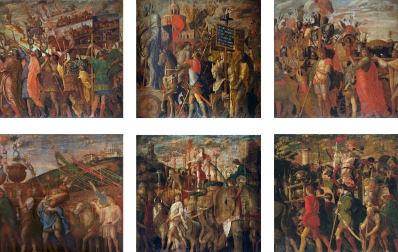 Las obras muestran el relato de las gestas militares del emperador Julio César, para las que Mantegna se sirvió de escritos de la época así de las antigüedades romanas, en particular en los arcos y columnas monumentales, que le sirvieron de inspiración.