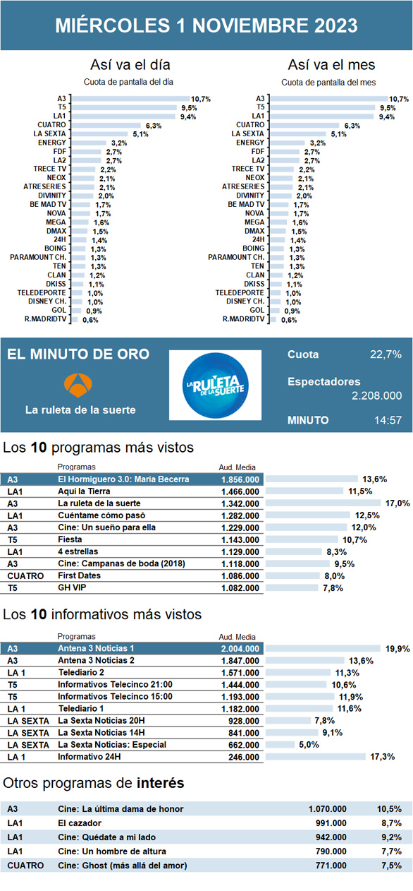 AUDIENCIAS: MIÉRCOLES 1 DE NOVIEMBRE DE 2023