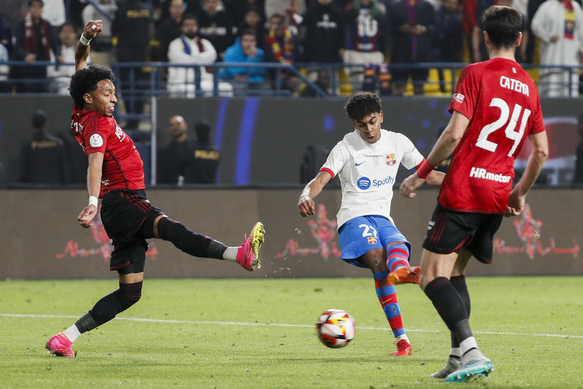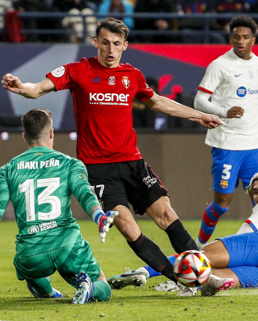 El portero navarro sostuvo a los suyos con paradas cuando su colectivo trataba de adelantar líneas -dejando espacios atrás-. Negó a Gündogan el tanto después del giro sensacional del mediocampista alemán -minuto 77-, justo antes de que los finalistas coperos pusieran sobre la mesa su garra. Cimentaron, con su energía y orgullo, un desenlace apretado en el que el Barça no supo defender con pelota -terminó saliendo desde atrás con pelotazos de Iñaki Peña-. Budimir y Raúl García dispusieron de sendos remates para el empate, mas fue Lamine Yamal el que abrochó el 2-0 en el minuto 93 -tras un eslalon sensacional de Joao Félix-. Suficiente para que los saudís vean otro Clásico. La Supercopa ya tiene finalistas.