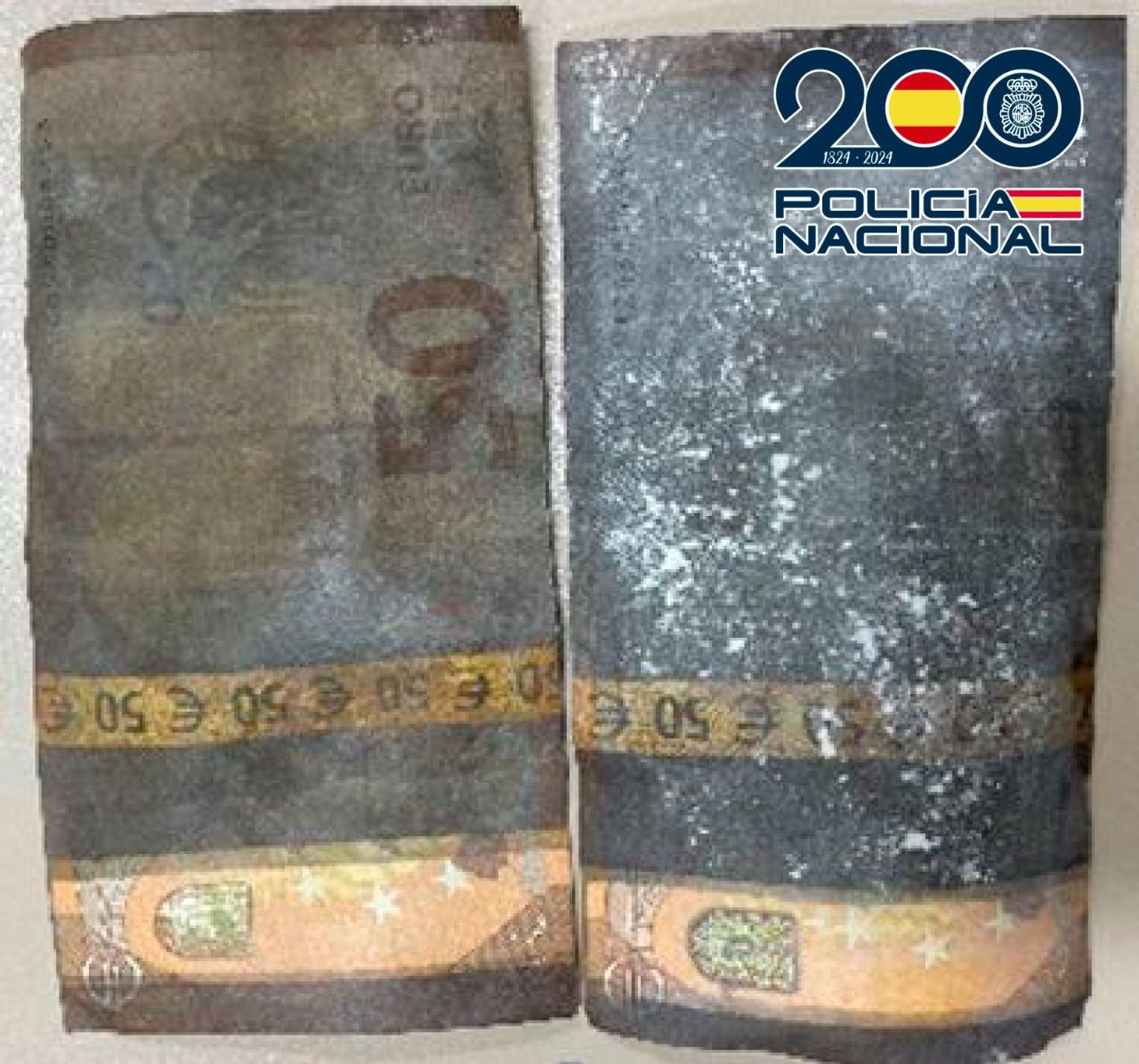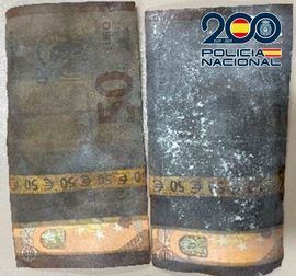 Tras contactar con diferentes implicados, a finales del pasado mes de octubre los agentes detuvieron a dos personas en Barcelona. Fruto del registro realizado en un vehículo localizaron numerosos efectos relacionados con los hechos investigados, entre ellos billetes falsos de 50 (6) y de 100 euros (1) y 1.550 euros en moneda de curso legal. Asimismo, intervinieron diversos productos químicos, 7 cartulinas y 12 planchas del tamaño del billete de 50 euros con el dibujo de dicho billete por anverso y reverso, láminas de color, documentos de identidad falsos y una caja envuelta en papel de aluminio con cable eléctrico dentro de la cual se hallaron dos billetes legítimos de 50 euros manchados y cubiertos de polvo de talco.
