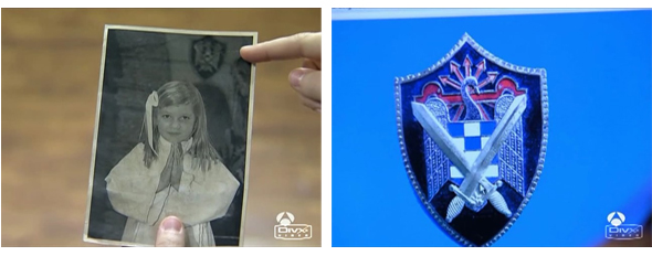 Para terminar con los símbolos nazis de la serie, hay una foto de Paula, una de las protagonistas, que aparece vestida de Primera Comunión y de fondo se aprecia un escudo en el que vemos dos espadas cruzadas. Detrás hay un águila con un yugo y el haz de flechas característicos de los símbolos fascistas.