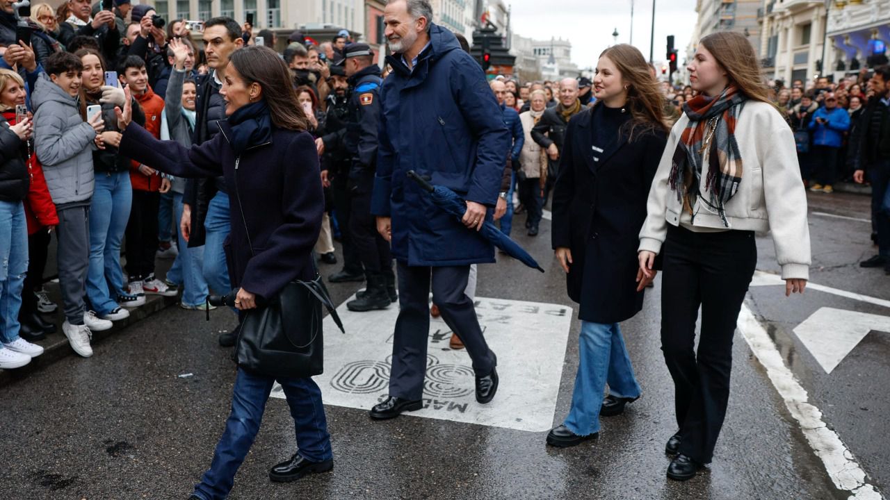 Los Reyes Felipe y Letizia, con la princesa Leonor y la infanta Sofía, se han unido este sábado a los fieles en la última procesión de esta Semana Santa en Madrid, la de la Real Congregación de Nuestra Señora de la Soledad y el Desamparo que no ha desfilado pero sí ha salido momentáneamente de la Iglesia de la Concepción Real de Calatrava, en el número 25 de la calle Alcalá.
