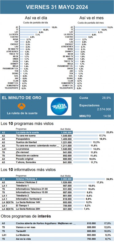 Así lo reflejan los datos del informe mensual de comportamiento de los espectadores de televisión en el pasado mes de mayo de Barlovento Comunicación, extraídos de Kantar Media.